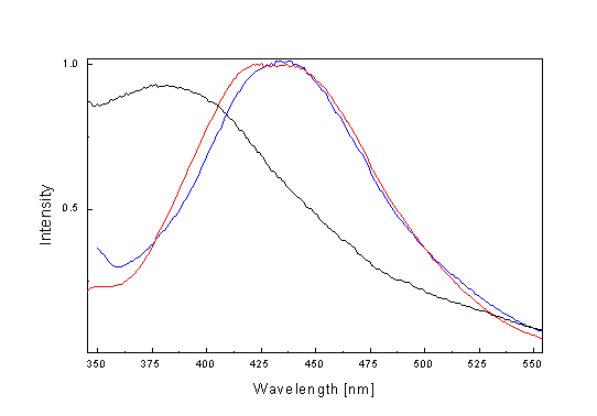 Fig. 3. Fluorescence emission spectra (l ex = 310 nm) of II ( blue) correspond 6-methylchromone-3-carboxaldehyde (red) and N-aminobicyclo[2.2.1]-5-heptenedicarboximide (black). Excitation spectra of the chromones depend on the wavelength of the emission (Fig. 4.). Changes in excitation spectra are caused by the photolability of the E-isomer