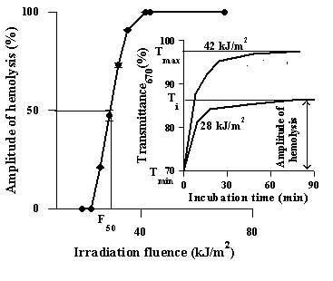 Human red blood cells (RBCs) were isolated from fresh heparinized donor blood. Cells were washed twice in PBS by centrifugation (10 min, 400 g). Concentration of RBCs was further adjusted to 2 ´ 107 cells/ml. Solution of photooxidized psoralen was mixed with RBCs suspension in ratio 1:1 V/V. The mixture was incubated at 37° C. In control experiments RBCs were incubated with nonirradiated psoralen solution. Hemolysis was monitored by the turbity measurement (670 nm) by means of a photoelectric colorimeter KFK-2MP (Russia). The transmittance of RBC suspension (107 cells/ml) was equal to 70% (Fig. 1, inset, Tmin) and increased up to 96-97% if all the cells in suspension were lysed (complete hemolysis, Fig.1, inset, Tmax). A linear dependence of the transmittance on the cell concentration was observed in this transmittance range. Depending on the irradiation fluence, POP solution could induce an incomplete hemolysis when only part of the cells lysed with transmittance curves reaching the plateau below Tmax (Fig. 1, inset, Ti ). The portion of the cells lysed was called an amplitude of hemolysis and calculated as: amplitude of hemolysis = [(Ti - Tmin)/(Tmax - Tmin)] ´ 100%. Dependence of an amplitude of hemolysis on psoralen irradiation fluence allowed to estimate a fluence at which lysis of 50% suspended cells could be achieved (Fig. 1, F50).