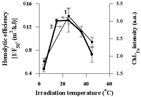 3.1. Effect of temperature on psoralen photooxidation in solution and formation of POPChL and POPhem The psoralen solution was irradiated at different temperatures. Addition of POP solution to the suspension of RBCs induced cell lysis. For quantitative evaluation of POP hemolytic activity, we assumed that (1) the same hemolytic effect (for example 50% amplitude of hemolysis) is induced in different experiments by the same amount of POP hemolysin and (2) the concentration of POPhem is in direct proportion to the fluence of irradiation. Then the relative quantity of POPhem produced per one unit of fluence can be determined as 1/F50, where F50 is the fluence of preirradiation of psoralen solution at which the amount of POP hemolysin that is formed is necessary for the destruction of 50% of the suspended cells. The value 1/F50 is defined as "hemolytic efficiency," and we propose that it is directly proportional to the yield of POP hemolysin formation. In Fig. 2, the dependence of hemolytic efficiency of POP on the temperature of psoralen solution during irradiation is presented. It is seen that POP hemolytic efficiency augmented with the temperature increase from 4 to 25° C. Further temperature increase up to 45° C leaded to the decrease in POP hemolytic efficiency. Thus, maximal yield of POP hemolysin was observed at 25° C. ChL flash is generated upon the addition of ferrous ions to POP. Intensity of ChLFe is signaling about the amount of destructible by Fe(II)-ions POP compounds. Psoralen solution was irradiated at various temperature with following registration of ChLFe (Fig. 2). Dependence of intensity of ChLFe on the temperature had its maximum at 25° C like that of POP hemolysin production. Fig. 2. Effect of temperature during psoralen irradiation on production of POP hemolysins and POPChL. The relative yield of hemolysins was estimated by hemolytic efficiency (curve 1), the relative yield of POPChL - by intensity of ChL accompaning an addition of Fe(II) to POP. Each point is the mean of three experiments ± SEM.