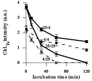 Fig. 3. Destruction of POP hemolysin in postirradiational storage. Numbers at the curves indicate: the first one - temperature during irradiation, the second - temperature during storage. Points are mean of three experiments ± SEM. Fig. 4. Destruction of POPChL in postirradiational storage. Numbers at the curves indicate: the first one - temperature during irradiation, the second - temperature during storage. Points are mean of three experiments ± SEM. The kinetics of POP4 and POP25 degradation in storage at 4 or 25° C as registered by ChLFe method are presented in Fig. 4. The intensity of ChLFe of POP decreased in storage of both POP4 and POP25 at either temperature used: 4 (Fig.4, curves 4/4, 25/4) or 25° C (Fig.4, curves 4/25, 25/25). In contrast to POPhem produced at 4° C, POPChL produced at 4° C was unstable at any temperature of storage and its degradation accelerated with increase in storage temperature. 4. Discussion In the present study we tryed to clarify whether hemolysis and Fe(II)-dependent chemiluminescence were mediated by the same products of psoralen photooxidation. We have found that temperature of psoralen solution during irradiation strongly affected hemolysis and chemiluminescence. The dependencies bared an analogous extreme character. Increase in irradiation temperature from 4 to 25° C resulted in augmentation of hemolytic efficiency and chemiluminescence of POP, whereas further increase in temperature up to 45° C resulted in decrease in both effects. Such correlation argued for the identity of POPChL and POPhem. The increase in POPhem at 25° C in comparison to 4° C could be explained either by increase in quantity of POP of the same type that was produced at 4° C or by generation of additional new POP product. To elucidate this we have studied the stability of POP produced at 4 and 25° C in storage at different temperatures. We have found that hemolytically active POP produced at 4° C consists only of the product(s) stable at 4° C (Fig.3, curve 4/4). Whereas degradation of POPhem produced at 25° C and stored at 4° C is described by at least two exponents and therefore POPhem produced at 25 ° C consists of at least two different compounds - stable and degrading at 4° C (Fig.3, curve 25/4). We propose the following kinetic scheme of formation of POP hemolysins. If irradiation is conducted at 4° C then POPhem of only one type is being formed (H1). This H1 is stable at 4° C. Postirradiational storage of H1 at 25° C showed that once temperature is higher than 4° C, H1 degrades with formation of inactive product IP1 (Fig.3, curve 4/25). Hence, if temperature of irradiation raised up to 25° C, at least two process occure: production of H1 and its degradation to IP1. To explain increase in hemolytic efficiency of POP produced at 25° C comparing to POP produced at 4° C, we further suggest that IP1 preserves the features of the chromophore and can absorb the energy of photons hn 2 yielding an active product H2. H2 is hemolytically more efficient and less stable than H1. Thermal destruction of H2 yields inactive product IP2:
