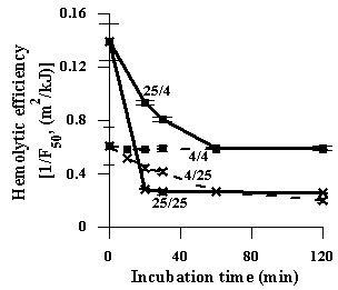 Photooxidized at different temperatures psoralen was then stored at 4 or 25° C with following addition to erythrocytes or registration of ChLFe. Fig. 3 depicts the dependence of hemolytic efficiency of POP produced at 4 (POP4) or 25° C (POP25) on the time of its storage at either 4 or 25° C. One can see that POP4 hemolytic efficiency was being preserved during storage at 4° C (Fig.3, curve 4/4) and decreased in storage at 25° C (Fig.3, curve 4/25). Hemolytic efficiency of POP25 decreased in storage at both 4 (Fig.3, curve 25/4) and 25° C (Fig.3, curve 25/25). As can be seen, the decrease in hemolytic efficiency of POP25 stored at 4° C reached the plateau after one hour and stayed equal to the hemolytic efficiency of POP4 stored at 4° C.