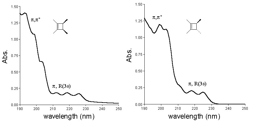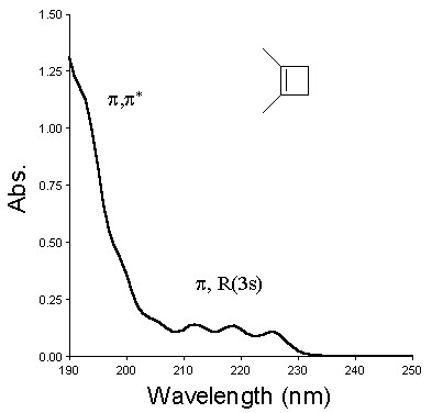 We have continued to worry about the involvement of the "Rydberg-like" excited singlet state in solution phase cyclobutene photochemistry. While the photochemistry of aliphatic alkenes in solution has often been explained in terms of the involvement of the p,R(3s) Rydberg excited state, there remain serious questions as to whether pure Rydberg states can exist in condensed phases. Solution phase alkene photochemistry can just as conveniently be explained as due to the population of a valence (p,s*) state, which either underlies or is mixed with the Rydberg state in the gas phase. In order to probe the true involvement of this excited state in solution phase alkylcyclobutene photochemistry and compare its behavior to the gas phase p,R(3s) state, we have carried out a comparison of the gas and solution phase photochemistry of three compounds: 1,2-dimethylcyclobutene (DMCB) and cis- and trans-1,2,3,4-tetramethylcyclobutene (c- and t-TMCB, respectively). The gas phase uv absorption spectra (1 atm, SF6) are shown below, with the p,p* and p,R(3s) absorptions assigned. The solution phase spectra lack the fine structure observed in the gas phase spectra, but tail out to similar wavelengths.
