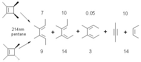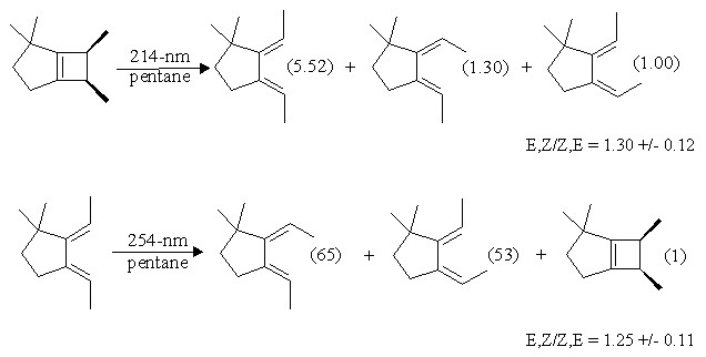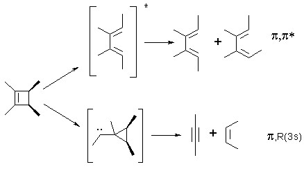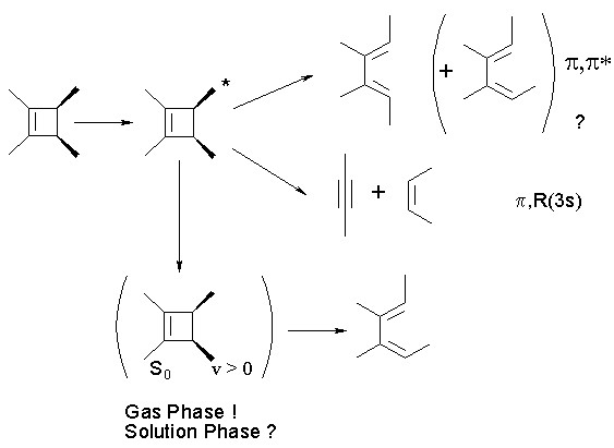 The two types of products have been explained in terms of two distinct mechanisms arising from different excited states. Ring opening is thought to occur in the p,p* excited singlet state to produce the formally photochemically-allowed diene isomer as the initial product, but proceeds adiabatically to form the excited diene which decays to form a mixture of diene isomers. Cycloreversion is believed to proceed mainly from an excited singlet state which in solution appears in roughly the same spectral position as the gas phase p,R(3s) Rydberg absorption. Both the Rydberg state (in the gas phase) and the "Rydberg-like" state (in solution) are at lower energies than the p,p* excited singlet state, at least in 1,2-dialkylcyclobutenes.