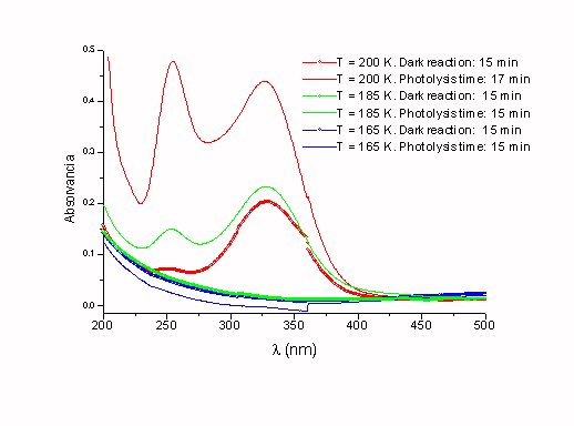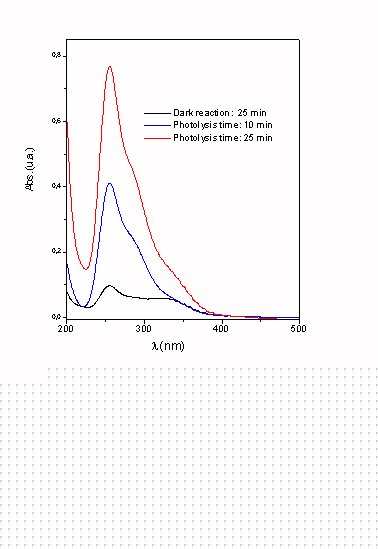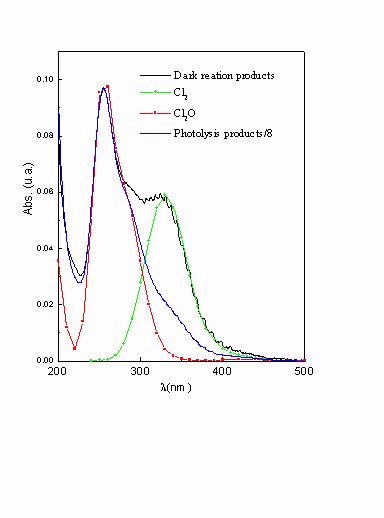 Table 1. Percentage of ClONO2 decomposed under illumination calculated as: 2 x (mole of Cl2 + mole of Cl2O). Excitation source: Hg lamp