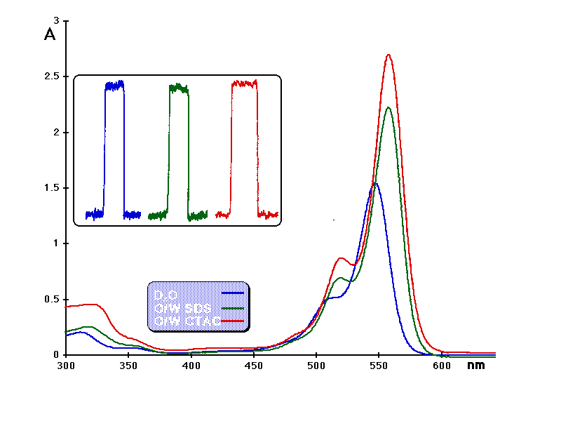 3.- RESULTS AND DISCUSSION 3.1 Reference sensitizers The well-known 1O2 sensitizers rose bengal (RB) and phenalenone (PN) were selected as references (values of FD of 0.76 and 0.98, respectively, were used). Absorption maxima of RB in microheterogeneous systems were red shifted compared to water. According to the spectral shifts (Figure 3), RB is exposed to a butanol-like environment when dissolved in microheterogeneous systems. It has been shown that the values of FD of RB are not modified in water and SDS micelles (0.75) and in methanol and CTAB micelles (0.76). Moreover, the ratio between FD of PN and FD of RB (FDPN/FDRB) was found to be constant and close to 1.3. ![]()