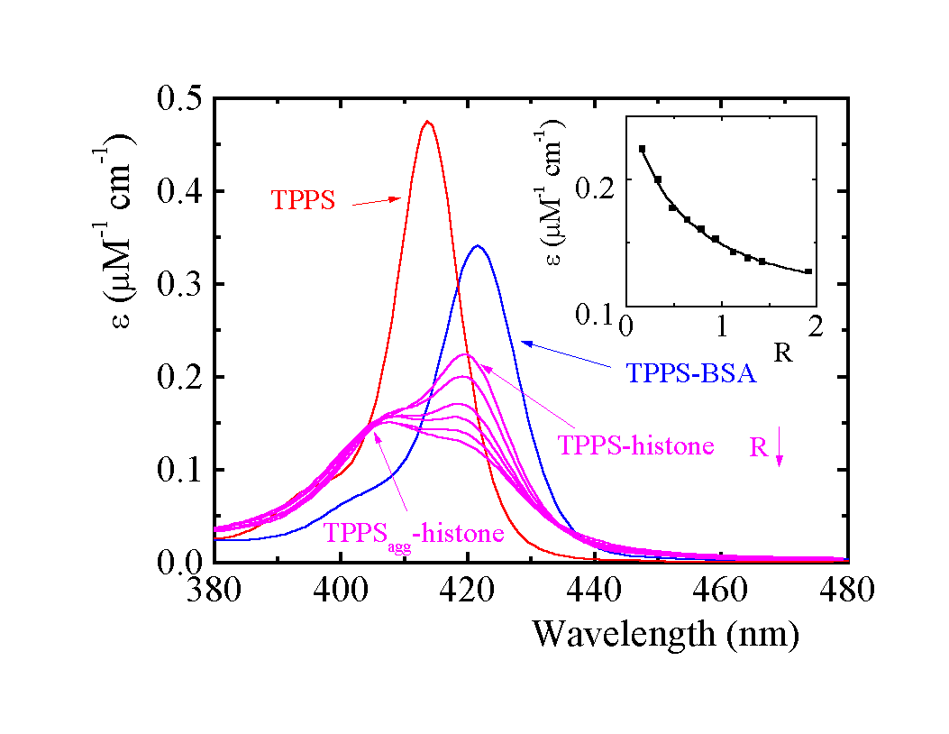 Spectral features of the TPPS/histone system confirm binding of TPPS on histone and the presence of several spectroscopically distinguishable porphyrin forms. Increasing ionic strength leads to liberation of TPPS from histone adducts. A parallel between the position and relative heights of absorption bands and fluorescence emission peaks of monomer bound to histone and to BSA shows that the hydrophobic microenvironment of both proteins has the same effect on spectral properties (Tab. 1): Fig. 1. Absorption spectra of TPPS in the Soret region: R (porphyrin/histone) = 0.16, 0.32, 0.64, 0.78, 1.27 and 1.90. With increasing R the observed e at 420 nm decreases (see inset). Phosphate buffer pH 5.70 (7 mM), 3.3 m M histone. Absorption spectra of 1.8 m M TPPS and of the TPPS-BSA adduct, R = 0.16.