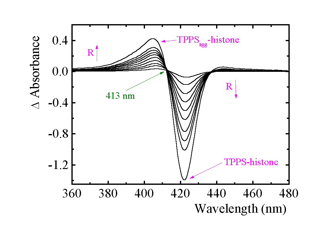 Difference absorption spectra of sensitizer-histone were recorded against BSA solutions with equal concentration of the sensitizer in the form of the sensitizer-BSA adduct. The isosbestic points at 413 nm for TPPS/histone and at 599 nm, 614 nm, 662 nm, and 697 nm for AlPCS/histone indicate an equilibrium between two species. The subtraction of the monomer peak from the total envelope of absorption spectra enables spectral characterization of a second form which differs from bound monomer: Fig. 2. Difference absorption spectra of TPPS in the presence of histone measured vs. monomer of TPPS bound to BSA (TPPS-BSA). Increasing R from 0.16 to 1.91 is indicated by the arrow. Phosphate buffer pH 5.70 (7 mM), ca 3.3 m M histone.