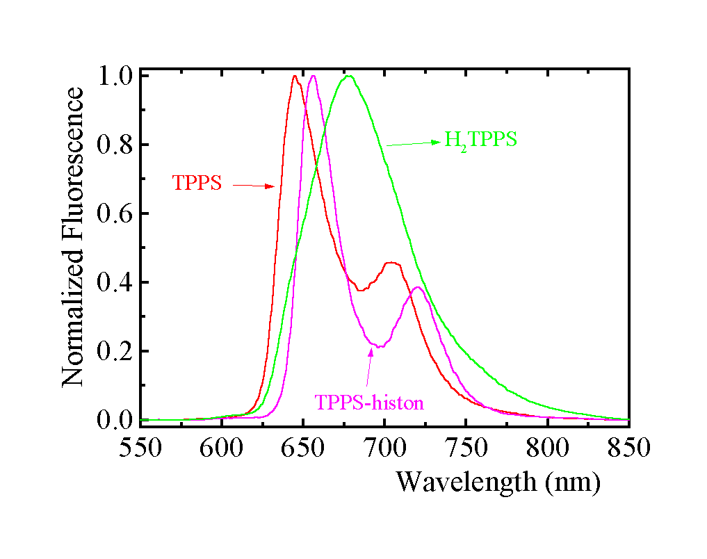 At pH < 5.70, two porphyrin nitrogens of TPPS are protonated to form the dianion H2TPPS (pKa = 4.8). When histone is added, the emission peak at 680 nm (Fig. 3), belonging to protonated H2TPPS, is fully substituted by the TPPS-histone emission peaks - only unprotonated TPPS is accommodated. Fig. 3. Normalized fluorescence spectra of TPPS using l exc = 519 nm and of protonated H2TPPS using l exc = 430 nm measured for the same sample. The emission peaks in the presence of 3.3 m M histone using l exc = 510 nm are shifted; in general they are independent of excitation wavelength. Phosphate buffer pH 5.70 (7 mM), 1.8 m M TPPS.