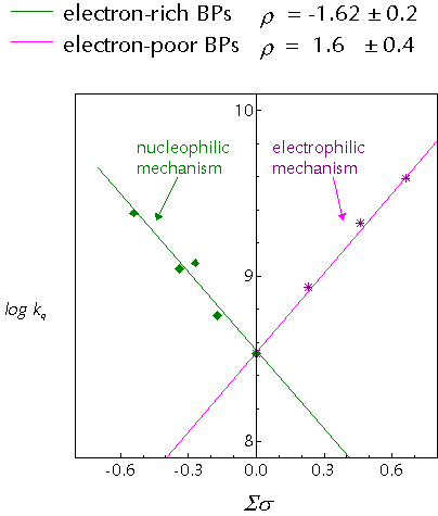 In general, the n,p* ketone reacts faster and more efficiently than the p,p* triplet. For some donors, the p,p* ketone triplet may not react at all. The reactions of aromatic ketone triplets with phenols have been briefly studied in the past. No products can be easily isolated from preparative experiments even though the rate of quenching of the ketone triplet by phenol has been shown to be very fast in both polar and non-polar solvents. Recently, we published a study on the interactions of substituted benzophenones with para-cresol and discovered discontinuous Hammett behaviour: The two different mechanisms are thought to arrive from different behaviour of the ketone triplet. In the 'electrophilic' mechanism, the electron deficiency of the n,p* state is exacerbated by the action of strongly electron-withdrawing substituents and in response the triplet draws charge from the arene nucleus of the cresol. This partial charge transfer weakens the O-H bond in the phenol and the hydrogen atom transfer rate is enhanced. The 'nucleophilic' mechanism represents novel behaviour for aromatic n,p* ketones, in which they behave as nucleophiles. A proposed mechanism to account for this involved hydrogen-bonding between the ketone triplet state and the phenol. The hydrogen-bond would speed formal hydrogen-atom transfer by allowing rapid electron/proton transfer to occur. It is generally agreed that the p,p* states of aromatic ketones are more basic than the ground state. Thus, for benzophenones (lowest n,p* triplets) this type of behaviour points towards the involvement of the upper T2 (p,p*) state in the photochemistry. This is in agreement with the well known fact that the n,p*/p,p* splitting in substituted ketones decreases as the substituents become more electron donating.