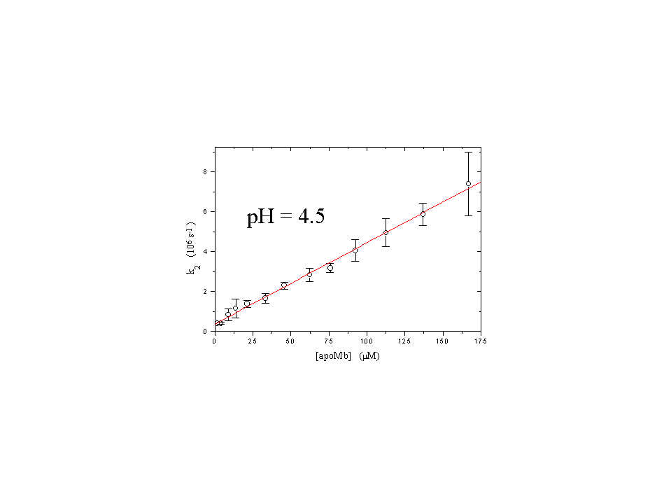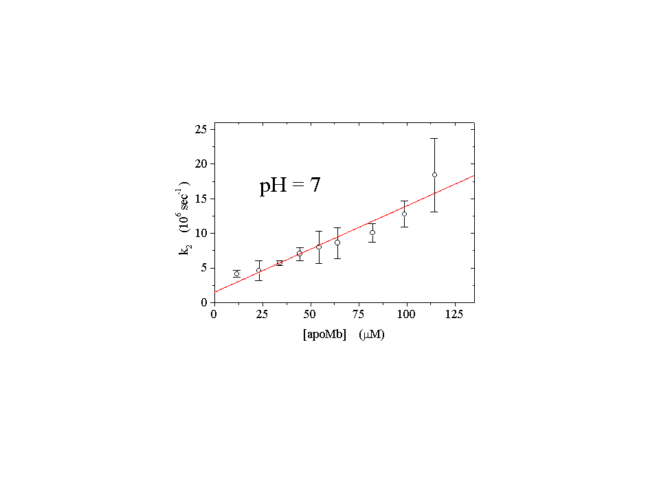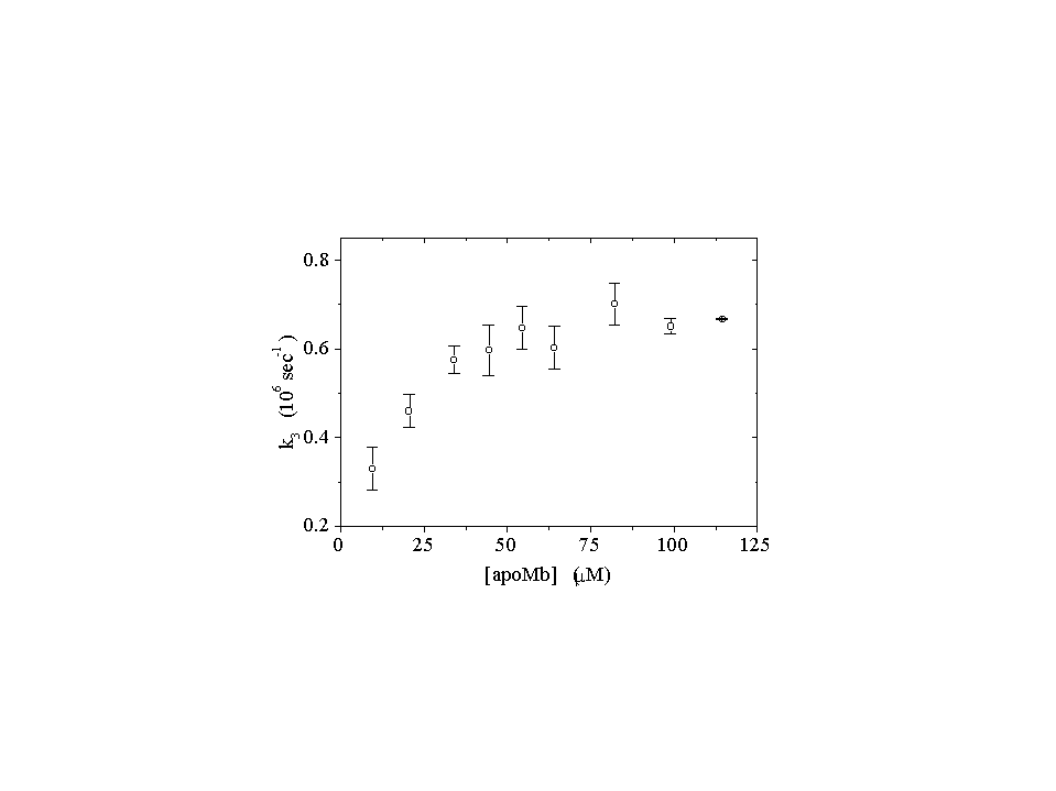 In order to determine the bimolecular rate constants for the protonation processes we have conducted concentration dependent experiments in which the concentration of the protein was varied at fixed pH. The concentration of the protein was much larger than the concentration of the photodetached protons and the reactions could be considered pseudo first order. From the slope of the apparent rate constant of the expansion accompanying the protonation of carboxylic acids as a function of the concentration of the protein we determine the apparent bimolecular rate constant at each pH. Data reported are at prepulse pH = 7 (rate constant for the expansion and for the contraction) and pH = 4.5 (only the expansion is present). The contraction shows a concentration dependence at low protein (bimolecular process) concentrations and a saturation at higher concentrations (sequential unimolecular process), indicating that the diffusion mediated binding of the protons is not the rate limiting step in this range. This transient is not observed below pH 5.5. The values of the lifetimes are close to each other and the two sequential transients cannot be separated by our experimental setup, also due to the small volume change (-1 ml/mol) accompanying the protonation of his residues. The volume change we detect is essentially determined by the following unimolecular, rate limiting step. Results are summarized in table1. In this table we have reported the values of the bimolecular rate constants (k2b and k3b) for proton binding, whereas the plateau value of k3b, k3p, has been used as an estimate of the rate of the sequential unimolecular process. Reaction volumes DVR,i have been calculated using the effciency of each process, considering the protonation reactions of carboxyls and histidines as parallel reactions. The value of DVR,2 is lower than the values observed for the protonation of carboxylates in simple molecules, which ranges around 15 ml/mol. However, as evidenced by Kauzmann (J. Rasper and W. Kauzmann, J. Am. Chem. Soc. (1962), 84, 1771-1777), the environment of the carboxyl groups strongly influences the value of the observed reaction volume. The small value of DVR,2 indicates that the groups that are being protonated are close to positively charged residues. The extent of the slower contraction (DVR,3)
