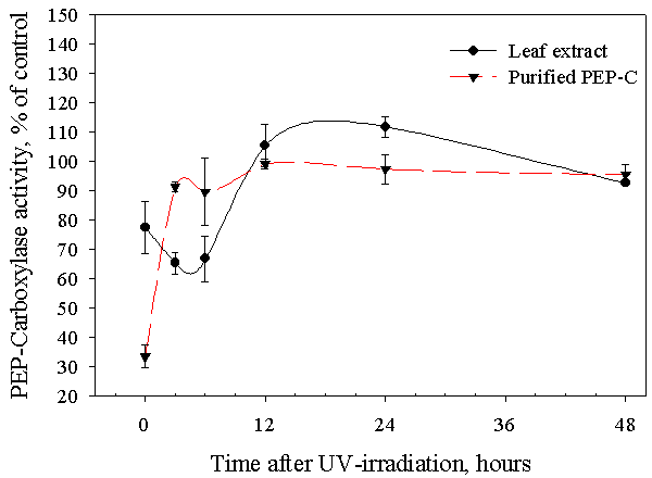 Fig. 3. Dynamics of PEP-carboxylase activity of protein extract and purified enzyme isolated from whole maize leaves after UV-irradiation during