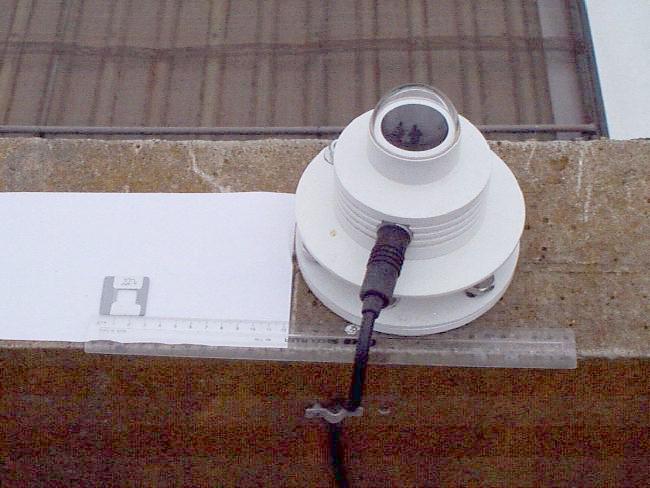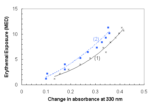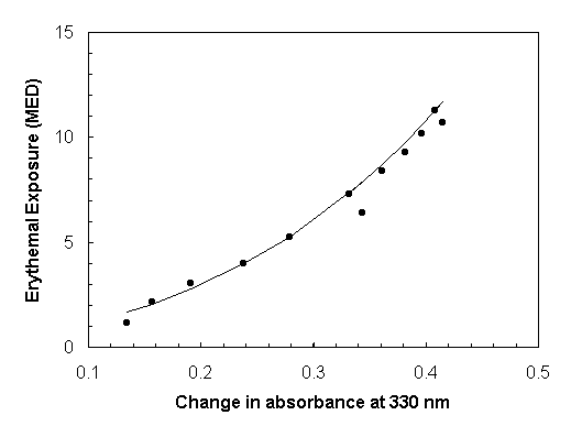 film of different thickness. 2. Materials and Methods 2.1 Film Thickness The polysulphone film of different thicknesses was produced at the University of Southern Queensland (USQ) Centre for Astronomy and Atmospheric Research. The technique developed with a specifically designed casting table ensures production of consistent and reproducible sheets of polysulphone film. The technique is similar with some variations to that utilised by the original producer (Davis et al., 1976). Polysulphone pellets (Aldrich Chemical Co., Inc. Milwaukee WI 53233 USA) were mixed with chloroform to form a solution and cast on a glass slab optically flat to 1 mm by a moving blade powered by a variable speed DC motor. The height of the blade is adjustable to produce the required thickness. The average thickness of the film was calculated employing the technique of Davis et al., (1981). This involves weighing a known surface area of the film and employing the density of polysulphone of 1.2 g cm-3 (Davis et al., 1981). Four film thicknesses of 18, 20, 30 and 45 mm were produced by setting the height of the casting blade above the glass slab to different values. The film was stored in the dark prior to use to prevent UV exposure prior to usage. 2.2 Calibration The erythemal UV exposure, UVery can be expressed by weighting the source spectrum S(l) with the CIE (1987) action spectrum for human erythema, A(l), as follows: The UVery may be measured with a calibrated spectroradiometer measuring S(l) or with a detector that possesses a sensitivity approximating the erythemal action spectrum. In this research, the polysulphone was calibrated against a temperature stabilised calibrated Biometer (model 501, Solar Light Co., Inc. 721 Oak Lane, Philadelphia, PA. 19126) in units of MED or minimum erythemal dose. One MED is the amount of biologically effective UV required to produce barely perceptible erythema after an interval of 8 to 24 hours following UV exposure (Diffey, 1992). The polysulphone was calibrated to the spring solar spectrum in October between approximately 11:00 Australian Eastern Standard Time (EST) and 13:00 EST. The Biometer was calibrated to a spectroradiometer with calibration traceable to the National UV Standard housed at the CSIRO National Measurement Laboratory. From the calibration the unit of one MED on the Biometer was equal to 210 J m-2. The film was fabricated into dosimeters of overall approximate size 3 cm x 3 cm with an aperture of approximately 1 cm2. A total of 48 dosimeters with 12 each constructed from film of the four thicknesses were employed. The complete batch of dosimeters for the four thicknesses was calibrated at once so that all four thicknesses were exposed to the same source spectrum. A photograph of the UV Biometer and a polysulphone dosimeter are provided in Figure 1. The calibration was performed on a horizontal plane in an unshaded position at Toowoomba (27.5 oS), Australia. Following the established procedure (Diffey, 1989), the optical absorbance of the film was measured pre- and post-exposure at 330 nm in a spectrophotometer (Shimadzu Co., Kyoto, Japan) to determine the change in optical absorbance at 330 nm (DA330) due to the UV exposure. The absorbance was measured at four sites over the film in order to take into account any minor variations in the film over the dosimeter. The dark reaction was taken into account by allowing a constant time between exposure and read-out and measuring the post-exposure absorbance on the following day. To see the full size image (47k) click on the picture above Figure 1 Photograph of the UV Biometer and a polysulphone dosimeter. 3.1 Comparison In Figure 2, the calibration data of the current film of 45 mm thickness is compared to the calibration in the literature. For a film thickness of 40 ± 4 mm, Diffey (1989) obtained a dose calibration of: UVery = 2000[9(DA330)3 + (DA330)2 + (DA330)] (2) in units of J m-2. In Figure 2, the factor of 2000 in Equation (2) has been converted to produce units of MED for the solid line in the Figure. The average difference between the calibration data points and the calibration in the literature (Diffey, 1989) compared to the literature calibration is 7%. The optical absorbances at 330 nm before exposure averaged over the four measurement