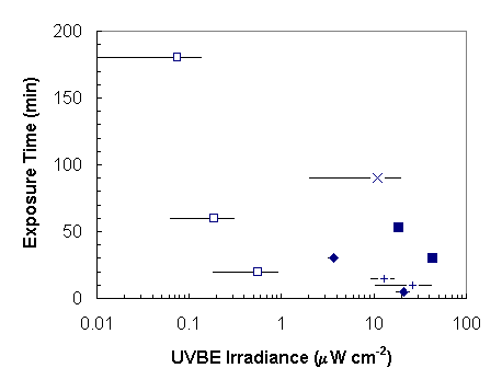 Abstract The ranges of conditions and environments of a dosimetric spectrum evaluator previously developed and employed in the evaluation of the UV source spectrum have been considered in this paper. The complete system of four dosimeter materials can be employed for a total UV exposure of up to approximately 10 J cm-2. The exposure times required were influenced by the UV environment. The exposure times ranged from 20 minutes to 3 hours for filtered solar erythemal UV, 5 to 30 minutes for solar erythemal UV, 30 to 53 minutes for quartz tungsten halogen lamp erythemal UV, 10 to 15 minutes for plant damage solar UV and 90 minutes for plant damage UV from fluorescent sun lamps. In these environments, employing the system in open and well-ventilated conditions minimises changes in the dose response of the system due to temperature. The results in this paper provide a guide for the range of conditions and exposure times required for different environments for future research employing the dosimetric spectrum evaluator. INTRODUCTION Ultraviolet (UV) radiation is a genotoxic and has a causative role in human skin cancer, premature skin photo-aging and wrinkling and some eye disorders (Longstreth et al., 1995). Additionally, increased ultraviolet irradiances due to stratospheric ozone depletion may affect plant growth (Caldwell et al., 1995). An improved characterisation and understanding through UV measurements of the solar UV exposures to humans and plants is required. The measurement of UV radiation in photobiological experiments has been