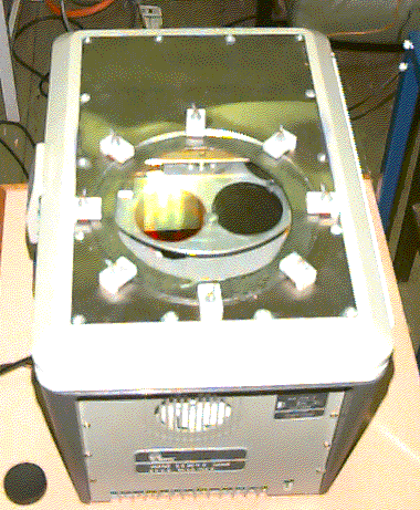 Figure 1 The Sky Camera in the laboratory, showing two of the filters used to record cloud images in the vicinity of the sun. In these studies the degree of solar obstruction and whole-sky cloud amount (not cloud near the sun), were determined visually (not automatically) from the images by subjective methods. McKenzie et al. (1998) attempted to use a commercially available video camera (Harnett, 1992), however the restrictions of lack of colour, narrow field of view, and the necessity of shading the sensor from direct sunlight limited its suitability. The sun centred sky camera was situated at Toowoomba, Australia (27.6 ° S, 696 m a.s.l.) at the campus of the University of Southern Queensland (Figure 1). Cloud measurements were recorded automatically by the sky camera and manually by an observer at the site over a period of 12 months (September 1997 to August 1998), at local noon each day. The sky camera system consisted of a standard video camera and a wide-angle lens. A stepper motor was used to point the camera in the direction of the sun in an east-west direction. The altitude angle of the camera was manually adjusted at the end of each week by approximately 2 ° to keep the sun in the centre of the field of view of the camera in a north-south direction. A second stepper motor was used to turn a filter wheel assembly, which was located above the camera lens. The first filter was opaque and ensured that the suns rays did not damage the CCD chip of the camera. Figure 2 A Block diagram of the Sky Camera System showing the major components of camera, PC, controller, stepper motors and UNIX workstation. A UNIX computer performed digital image processing. Figure 2 shows a block diagram of the sky camera system and the reader is referred to Sabburg & Wong (1997) for a full description. The images had varying contrasts between the sun, sky, and clouds, and the sun was approximately in the centre of the image (Figure 3a). In the initial version of the image processing software, a non-linear approach was used and this method was evaluated by comparison to visual interpretation of the recorded sky camera images (Sabburg & Wong, 1998). The image processing software positioned the sun at the centre of the image and determined if the sun was obstructed or not. The sun was removed (subtracted), from the image and a measure of cloud cover around the sun was made (Figure 3b). The methodology of the new approach differs by using a linear algorithm that varied from the above method in the areas of filter selection, thresholding, handling bright cloud obstructing the sun and the underestimation of the area of dark cloud (Figure 3c).