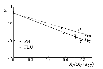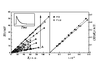 vs the absorption factor. The ratio of slopes shows that the FD values for PN and FLU are in the ratio 0.93 in 1,4-dioxane. In