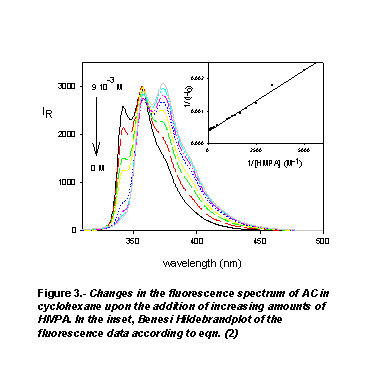 Turning now to the AC-HMPA system, time-resolved fluorescence measurements showed that, independently of the emission wavelength, the fluorescence of the cyclohexane solutions of AC in the presence of HMPA decayed monoexponentially. The lifetimes of the decays were very close to that of no bonded AC, 6.4 ns, and slightly increased as the acceptor concentration increased. Double exponential analyses were also attempted, but neither c r2 nor c g2 improved. Furthermore, the second component of these analyses revealed at random and, occasionally, physically inexplicable negative contributions to the overall decay. We think that this conflicting result is an artifact of the fitting procedure which cannot satisfactorily resolve lifetimes whose values differ less than 1 ns [15]. Thus, the fluorescence decays of AC-HMPA solutions in cyclohexane could also be reasonably interpreted according to Scheme 1, assuming a system formed by a mixture of two independently absorbing and emitting species, the complex and the no-bonded AC, with very close fluorescence lifetime. Interestingly, HMPA, possibly due to geometrical constrains, does not appreciably quench the fluorescence of free AC.