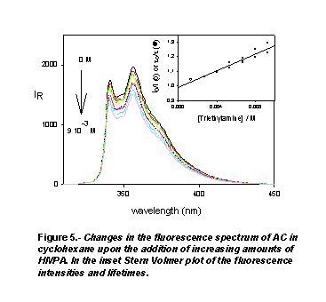 are linears with intercept values, k0, very close to that of the reciprocal of the lifetime of no-bonded AC in cyclohexane, t 0=6.4 ns. The slopes of these plots, kq, are reported in Table 1. At the red end of the emission spectra, this short lifetime component dissapears and the fluorescence decays could reasonably be fitted to monoexponential functions with lifetimes whose values, within the experimental error, are equal to those of t 2.