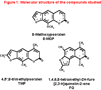 Now we report some data obtained comparing FQ to a well-known and very active linear furocoumarin, 4,5’,8-trimethylpsoralen (TMP). Both TMP and FQ can photobind to DNA by UVA irradiation to a high and very similar extent; on the other hand, only TMP shows a strong capacity of inducing ISC [Bordin et al., 1996; Dardalhon et al., 1988]. As a reference compound, we chose 8-methoxypsoralen (8-MOP). The molecular structure of the studied compounds is shown in figure 1.