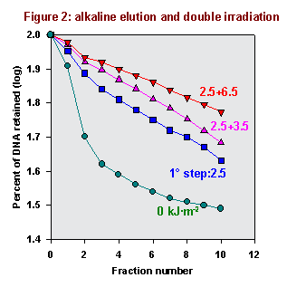 However we can suggest the following hypothesis. According to Rosenstein and Lai [1991], DPC seem to be repaired by topoisomerases. These authors used a frog ICR 2A cell line, very proficient in photoreactivation; the cells were exposed to high doses of light at wavelength greater than 350 nm, which together with DPC, induce reduced extents of dimers. Then, cells were submitted to photoreactivation: thus, pyrimidine dimers were removed, but DPC remained unchanged. During the first two hours of post-incubation, the authors observed an increase in DPC and DNA breaks; in addition, breaks appeared to be associated to DPC so generating typical lesions of topoisomerases. At longer incubation time, both DPC and breaks disappeared. Considering the formation of DSB, we suggest that DPC repair might be accomplished by topoisomerase II activity.