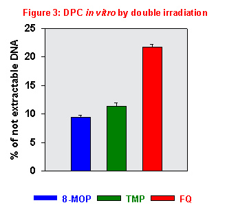 As now it has been revealed TMP forms two kinds of bifunctional adducts, biological responses obtained by various authors with TMP and the double irradiation protocol were incorrectly interpreted as always seen as consequences of ISC alone. Moreover, considering the strong biological effects associated with DPC formation, the conclusions reported by the papers dealing with the biological effects of TMP, [e.g., Laquerbe et al., 1995] must be undoubtedly reconsidered. In this connection, we must point out that DPC seem to be highly genotoxic as observed after FQ sensitization by the double irradiation method [Marzano et al., 2000].