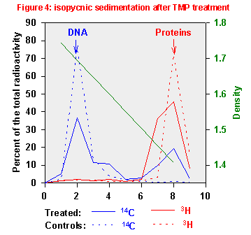 This behavior suggests that TMP, like FQ, induces covalent biadducts linking together DNA and proteins. To investigate this point, we carried out some experiments by isopycnic centrifugation in CsCl gradients.