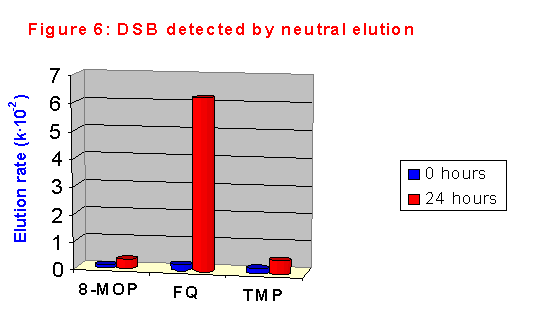 At first we studied the formation of double strand breaks (DSB) in CHO cells using neutral elution. The results are shown in figure 6. As expected, no significant DNA fragmentation could be detected just after sensitization; after 24 hours of post-treatment incubation, FQ induced DSB to a very high extent. Amazing, in spite of its exceptional capacity of damaging DNA, TMP induced a lower amount of DSB, which is very similar to that formed by 8-MOP.