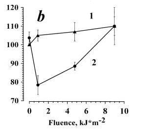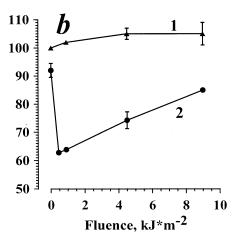 (b) In the curve 2, the points for the irradiation doses 0 and 4.5 kJ/m2 were obtained as the mean of 3 independent experiments±SEM; the points for the irradiation doses of 0.45, 0.9, and 9 kJ/m2 were obtained from a single experiment at each dose.