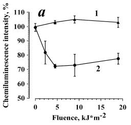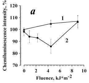 In Fig. 3b, data are presented on the dependence of the amplitude of zymosan-stimulated cellular ChL on the dose of irradiation in the presence of AlOOH (10-6 M). At low irradiation doses (0.9 kJ/m2), a considerable ChL inhibition (curve 2) was observed. The effect is eliminated with an increase in the irradiation dose. In the control samples, ChL of the cells irradiated without AlOOH was almost unchanged (curve 1), like in the experiment shown by curve 1 (Fig. 3a). Thus, AlOOH photosensitized inhibition of zymosan-stimulated ChL of neutrophils was confirmed.