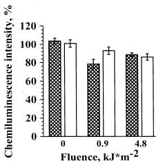 The hydroxyl radicals formed in AlOOH photolysis are known to play the main role in the mutagenous and antiproliferative effects on mouse lymphoma cells[14]. To estimate the contribution of hydroxyl radicals in the inhibition of neutrophils RB, we studied the effects of hydroxyl radical trap, mannitol. The cells were irradiated with UVA light at the doses of 0.9 and 4.8 kJ/m2 in the presence of AlOOH (10-6 M) and mannitol (10-5 M) (Fig. 4). In the control samples, cells were irradiated in the presence of AlOOH but without mannitol .Mannitol in the concentration used in our experiments (10-5 M) did not influence the ChL amplitude of non-irradiated cells both in the presence (Fig. 4) and in the absence of AlOOH (data are not presented).