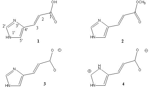 5. (a) H.Morrison, C.Bernasconi, G. Pandey, A wavelength effect on urocanic acid E/Z photoisomerization, Photochem.Photobiol. 40 (1984) 549-550; (b) H.Morrison, D.Avnir, C.Bernasconi, G. Fagan, Z/E photoisomerization of urocanic acid, Photochem.Photobiol. 32 (1980) 711-714; (c) K.M. Hanson, B. Li, J.D. Simon, A spectroscopic study of the epidermal ultraviolet chromophore trans-urocanic acid, J.Am.Chem. Soc. 119 (1997) 2715-2721; (b) B. Li, K.M. Hanson, J.D. Simon, Primary process of the electronic excited states of trans-urocanic acid, J.Phys. Chem.A, 101 (1997) 969-972; (d) K.M. Hanson, J.D. Simon, The origin of the wavelength-dependent photoreactivity of trans-urocanic acid. Photochem.Photobiol. 67 (1998) 538-540.