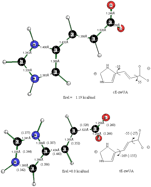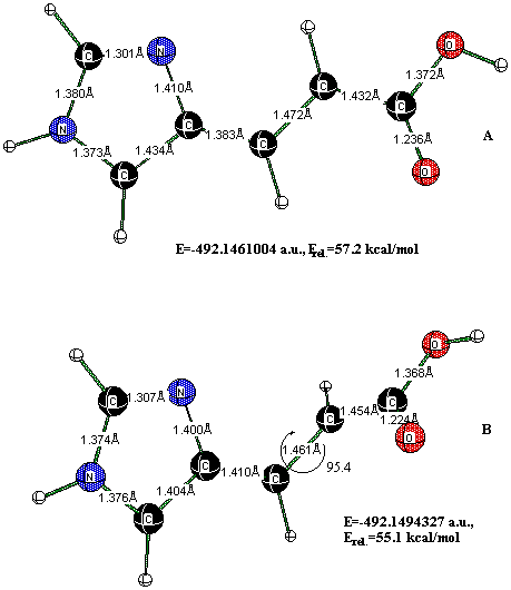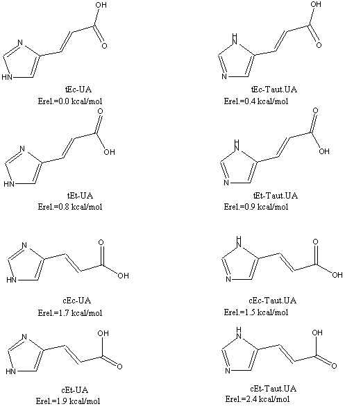 9. (a) A. Lahti, M.Hotokka, K. Neuvonen, P.Ayras, A theoretical study of the conformers of trans- and cis-urocanic acid, J.Mol.Struc. (Theochem) 331 (1995) 169-179; (b) A. Lahti, M.Hotokka, K. Neuvonen, P.Ayras, Quantum-chemical gas-phase calculations on the protonation forms of trans- and cis-urocanic acid, Structural Chemistry, 8(5) (1997) 331-342; (c) A. Lahti, M.Hotokka, K. Neuvonen, G. Karlstrom, A CASSCF study on the lowest pi ->pi* excitation of urocanic acid, Int.J.Quant.Chem., 72(1) (1999) 25-37; (d) C.S. Page, M. Merchan, L. Serrano-Andres, M. Olivucci, A theoretical study of the low-lying excited states of trans- and cis- urocanic acid, J.Phys.Chem. A. 103 (1999) 9864-9871; (e) A. Lahti, M.Hotokka, K. Neuvonen, G. Karlstrom, Quantum chemical calculations on the intramolecular hydrogen bond of cis-urocanic acid, J. Mol. Struc. (Theochem) 452 (1998) 185-202.