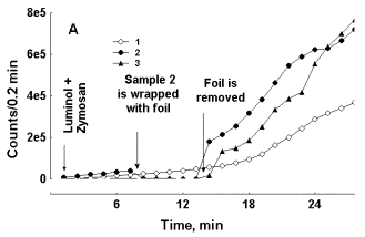 Non-diluted blood is a system with a very high optical density and the ratio of neutrophils to erythrocytes in it is approximately 1:1000, so the question arises as how these very low intensity photon fluxes may have any measurable effect upon neutrophil activity it. It should be noted that blood in our experiments was not actively oxygenated. Previously we had demonstrated that LC-CL in blood is strongly dependent upon the interaction of neutrophils and erythrocytes, and that LC-CL depends on oxygen supplied by erythrocytes 9. Taking into consideration that lmax for luminol emission is 427 nm and for lucigenin emission it is 470 nm, and that several hemoglobin absorption maximums are not far from this spectral region, hemoglobin may be excited by back reflected photons. It is interesting to speculate that oxyhemoglobin excitation could support oxygen release from erythrocytes resulting in easier substrate supply for generation of ROS by neutrophils and enhancement of CL intensity in blood.