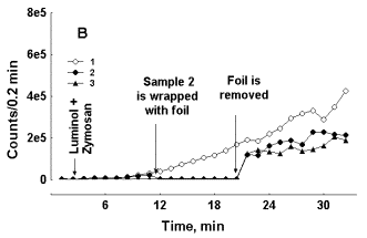 CL from blood was registered in liquid scintillation counters Mark-II (Nuclear-Chicago, USA), equipped with photomultipliers EMI 9750QB/1 in the mode of single photon counting (out-of-coincidences mode) in a tritium window. All measurements were performed at room temperature (19-21 oC). 1 ml Eppendorf polyethylene test tubes were used as blood containers. Dark counts with an empty test-tube in a counting chamber varied in the range of 50-60 counts/sec. All the operations were performed at dim ambient light illumination. In each experiment from 2 to 6 test tubes were filled with 0.2 ml of blood of the same donor. Half of the test tubes were completely wrapped with screens of aluminium foil and another half served as a control. After addition of zymosan and either of CL sensitises to blood all the samples in each experiment were counted in rotation unless otherwise noted. At different time points after the beginning of the experiment screens were removed from the experimental samples and CL detection was continued. In another experimental set-up for the studies of the effects of back reflected photons upon the cells, Eppendorf test tubes with blood were alternatively fixed either in empty glass vials, or in vials filled with water. In the former case some photons emitted from blood were reflected by the inner glass wall of a vial and returned back to blood sample installed in the optical focus. In the latter case count rate was about 15% higher than in the former due to the so called immersion effect of water (since refractive index of water is much more close to the refractive index of glass than that of the air, more light leaves the system filled with air).