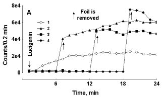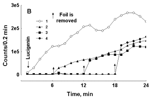 Figure 2. Effect of aluminum foil screen on LC-CL development in two preparations of blood with slow (A) and fast (B) CL development. Curve 1 – control test tube, curves 2-4 -- test tubes were wrapped with foil before lucigenin addition. Foil was removed from respective test tubes at moments indicated by arrows. In each experiment a preparation of blood was distributed in equal portions among 4 samples, which were counted in the mode of rotation. Note the difference in ordinate scale values in A and B.