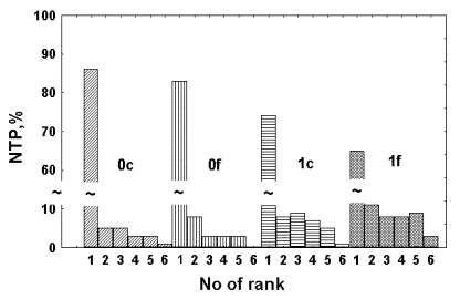 The ability of neutrophils to reduce nitro-blue tetrasolium (NBT), expressed as percent reducing neutrophils was evaluated by a common method [11]. In brief an aliquot of blood (50 mkl) was taken from a blood sample, mixed with 50 mkl of 0,1% NBT solution in 0,15 M Na-P buffer (pH 7,2), the mixture was incubated at 37 oC for 20 min and at 20 oC for 20 min. Blood was smeared on a slide, dried out, fixed with methanol for 10 min. Slides were dyed with methylene green. 100 neutrophils were counted at each slide. NBT test was considered positive when dark blue diformasan granules (the product of NBT reduction) occupied from 5 to 100% of neutrophils cytoplasm. All the cells were grouped in 6 ranks according to their activity: range 1 -- 0%, range 2 -- 5-7%, range 3-- up to 30%, range 4 -- 30-50%, range 5 -- 50-90%, range 6 -- 100% of cytoplasm is filled with reduced diformasan granules.