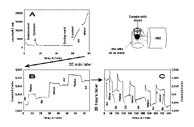 Recently we reported that under some circumstances highly significant photon emission can be registered from non-diluted human blood, and its intensity may increase enormously upon addition of luminol [7]. RB induction in blood in the presence of luminol was always followed with a great elevation of photon counts rate. Despite a very low optical transparency of non-diluted blood in the range of the emission range of luminol, maximal counts rate attained was often exceeding that observed in suspensions of neutrophils containing the same quantity of cells. Parameters of photon emission from blood depend more on its physiological state and metabolism then on its optical properties[8]. LC-CL can also be registered from non-diluted human blood even without any additives inducing RB of neutrophils and when LM-CL is negligible [9]. Here we test the hypothesis, that LC-CL reflects normal oxygen reducing activity of white blood cells proceeding steadily at least in venous extravased blood. We also demonstrate that both LC-CL and LM-CL in whole blood may be stimulated by very weak photon fluxes and by carbon monoxide added to blood in tiny quantities.