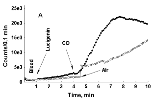 To test this hypothesis we tried to test another way for the facilitated oxygen release from erythrocytes. It is well known that CO affinity to Hb is more than 300-fold higher than that of O2, and if CO binds to 1 heme, enough energy can release to facilitate the dissociation of O2 from multiple HbO2 complexes. If this is the case, addition of CO to whole blood may enhance oxygen release and CL intensity boost.