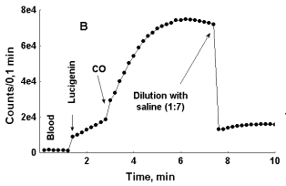To assess this supposition one bubble of carbon monoxide (ca. 1 mkl) or of air was passed through 0,2 ml of whole non-diluted blood or through 0,2 ml of neutrophil suspension containing same quantity of these cells as in non-diluted blood. As it can be seen in Fig. 5 (A and B), addition of CO to blood results in rapid boost in LC-CL in it unlike addition of air. In Figure 5, B it can be seen that after blood dilution with physiological saline intensity of LC-CL immediately falls down. Previously we observed a similar effect of blood dilution upon LC-CL both in the case when its intensity was not stimulated with CO and interpreted it as indicating of close relationships between the cells responsible for reactive oxygen species, and hence, CL production, and erythrocytes 9.