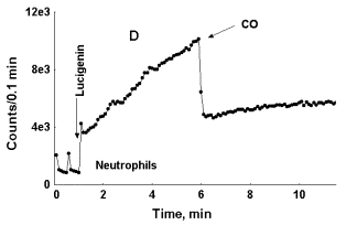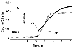 In Figure 5, C, photon emission increases both in the case of CO and air bubbling through blood, but in this particular specimen of blood initial rise in LC-CL was more rapid than in specimens, where only CO induces enhancement of LC-CL. While in the specimen of blood presented in Figure 5, A, LC-CL intensity reached 2500-3000 counts/0,1 min within 3 min after LC addition to it, in the specimen of blood presented in Figure 5, C, it reached 25 000 counts/0,1 min within 2 min after LC addition. Here again we can see that depending upon initial acceleration of CL intensity the effect of an external factor upon it may either be exposed, or hidden. In general, a specific CO effect was consistently observed in blood of healthy donors, while in blood of patients, where initial acceleration of photon emission was much higher (asthma, diabetes) it was either weak or absent. The effect of CO bubbling through neutrophil suspension upon LC-CL was opposite to that observed in whole blood (Fig. 5, D). Here CO strongly attenuated LC-CL. Thus, the effects of carbon monoxide upon the processes followed with LC-CL were opposite in whole non-diluted blood and in pure neutrophil suspensions.