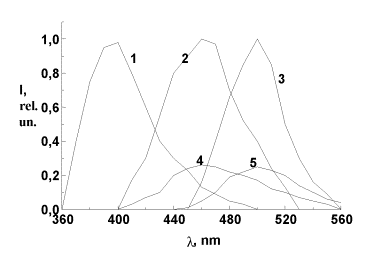 Figure 1. Spectra of fluorescence of neutral – 1 and cathion – 2 form of 4PyPO, quaternary salt 4PyPOCH2PCl – 3 and photoproducts of 4PyPO – 4,5. lex: 1 – 3 -308 nm, 4 – 400 nm, 5 – 430 nm.