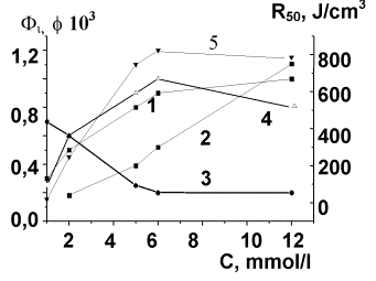 Figure 2. Dependence of quantum yields of phototransformation j – 1, lifetime – 2 and yields of photoproducts Фlas –3, Ф3 – 4, Ф2 – 5 on concentration of coumarin 153.
