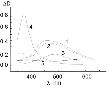 Figure 3.Spectra of 4PyPO transient absorption –1-3 in ethanol, 4-5 in water. Additions: NaOH (1mmol/l) – 2,5; DABCO (25 mmol/l) – 3.