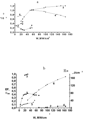 Figure 4. Dependence of phototransformation’s characteristics and efficiency of LOS1 on density of excitation power. a) quantum yield of phototransformation: modification 1 –1, 2; modification 2 – 3 – 5. Lasing – 1 – 3; nonlasing – 4, 5. C=1mmol/l –1, 3, 5; 0.1 mmol/l – 2, 4. b) efficiency – 1, 2; lifetime –3, 4; yield of photoproduct Flas – 5, 6. Modification 1 –1, 3, 5; modification 2 – 2, 4, 6. C=1mmol/l.