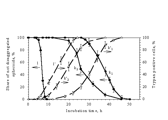 Fig. 1 illustrates the disaggregation (1, k1, k2) and trypan positive cell formation (1’, k1’, k2’) in HeLa Cx43 spheroids after PUVA-treatment (1, 1’) and in the process of dark incubation (in control) of spheroids with psoralen (k2, k2’) or without psoralen (k1, k1’).