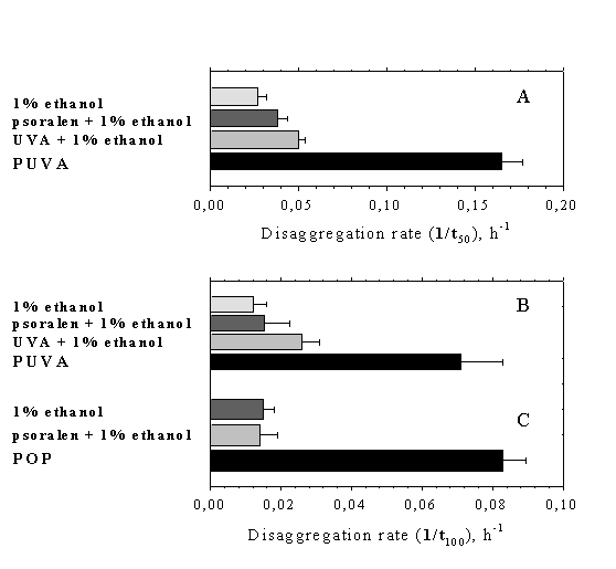 where (1/t50)PUVA and (1/t50)UVA are the rates of PUVA-and UVA-induced disaggregation, respectively; (1/t50)Ps and (1/t50)0 are the rates of dark psoralen effect and spontaneous disaggregation (without any influences), respectively.