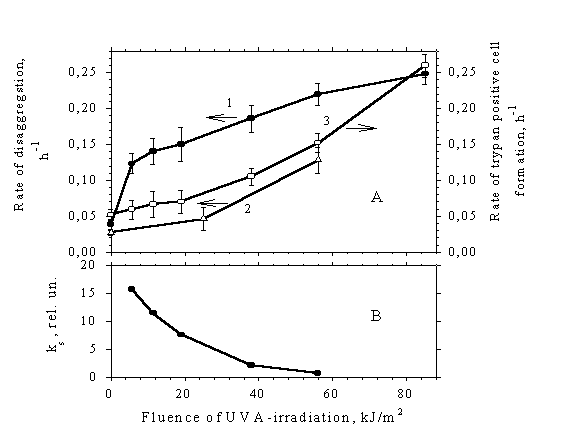 Fig. 3. (A) Fluence dependences of the rates (1/t50) of PUVA-induced (1) or UVA-induced (2) cell disaggregation and PUVA-induced trypan positive cell formation (3) in HeLa Cx43 spheroids. (B) Fluence dependence of photosensitization coefficient Spheroids twice washed in Dulbecco’s medium were incubated with psoralen (10-4 M, 1% of ethanol), then UVA-irradiated (365 nm, 25 W/m2) with various fluences and incubated at 37oC (1, 3). In control (2), spheroids were preincubated with only 1% of ethanol (without psoralen) before UVA-irradiation. A rate of disaggregation was estimated as the inverse time of disaggregation of 50 % of spheroids. A rate of trypan positive cell formation was estimated as the inverse time of the appearance of 50 % of trypan positive cells in spheroids or in cell suspension after their complete disaggregation. Photosensitization coefficient (ks) was calculated as described in Materials and Methods section.