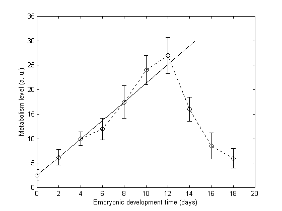 Figure 2. Protoporphyrin IX metabolism level as a function of the embryonic development time (dashed line). Bars show standard errors from four indep-