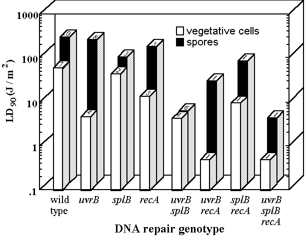 The NER and SP lyase systems are also important for spore resistance to solar radiation, as mutant B. subtilis spores lacking both repair systems exhibit extreme sensitivity not only to laboratory UV-C radiation (Munakata, 1969), but also to the UV wavelengths present in sunlight (Munakata 1981; 1989; 1993; Quintern et al., 1994; Tyrrell, 1978; Wang, 1991; Xue and Nicholson, 1996).