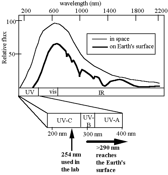 How well does the current laboratory model describe spore UV resistance in the environment? Solar radiation reaching the Earth’s surface is considerably more complex than artificially-produced monochromatic 254-nm UV,consisting of a mixture of UV, visible, and infrared radiation, the UV portion spanning approximately 290-400 nm (the so-called UV-B and UV-A portions of the UV spectrum) (Urbach