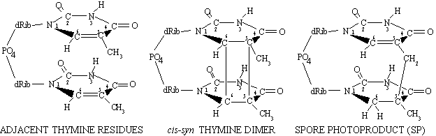 In agreement with the current laboratory model, it has been well- documented that DNA in spores exposed either directly to solar radiation, or in the laboratory to UV wavelengths present in sunlight, accumulate mainly “spore photoproduct” (SP; the thymine dimer 5-thyminyl-5,6-dihydrothymine) as the major UV photoproduct (Tyrrell, 1978) (Fig. 3).
